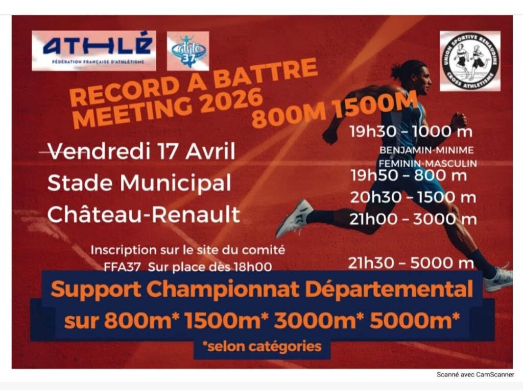 Championnats départementaux du 37 – 41 sur : 800m H/F, 1500m H/F, 3000m H/F et 5000m H/F, 1000m Benjamins – Minimes H/F Infos et horaires